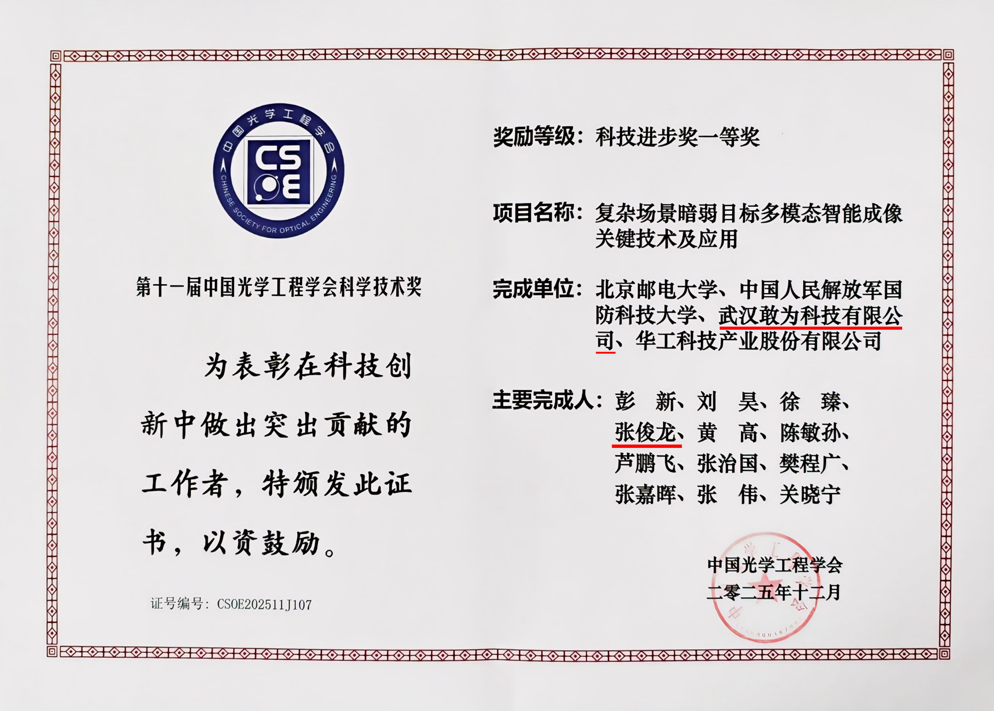 近日,我國光學工程領域權威獎項——第十一屆“中國光學工程學會科學技術獎”獲獎名單正式公布。敢為科技與北京郵電大學、中國人民解放軍國防科技大學、華工科技產業股份有限公司組成的項目團隊,憑借“復雜場景暗弱目標多模態智能成像關鍵技術及應用”項目,榮獲科技進步獎一等獎。