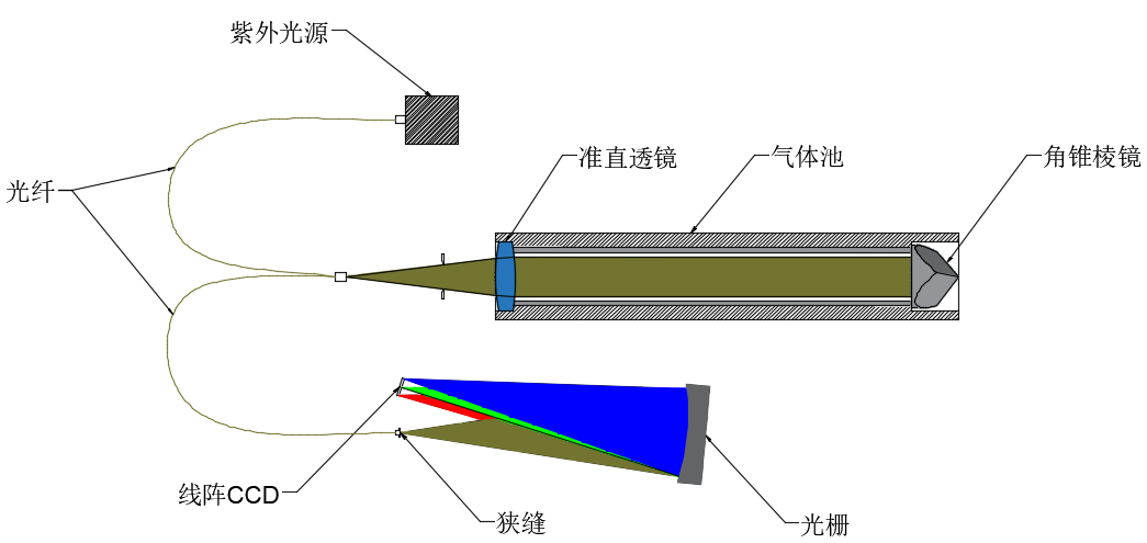 紫外光源發出的紫外光經準直透鏡準之后進入氣體池,經樣氣吸收后的紫外光通過聚焦透鏡聚焦后耦合進光纖并傳輸到光譜儀中。經過光柵分光、CCD接收光信號進行光電轉換,得到待測氣體的紫外吸收光譜,通過對光譜進行差分分析,并結合化學計量學算法及科學的數學模型,可以得出相關氣體成分的濃度。