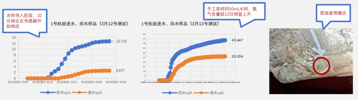 設備投入運行后,通過實時在線監測1號機定冷水含氫量,很快明確了漏氫現象,準確地測量出氫氣泄露量,并參照《防止電力生產事故的二十五項重點要求》及時給出建議停機檢修的建議,成功地預警了滲漏缺陷及其進一步影響。