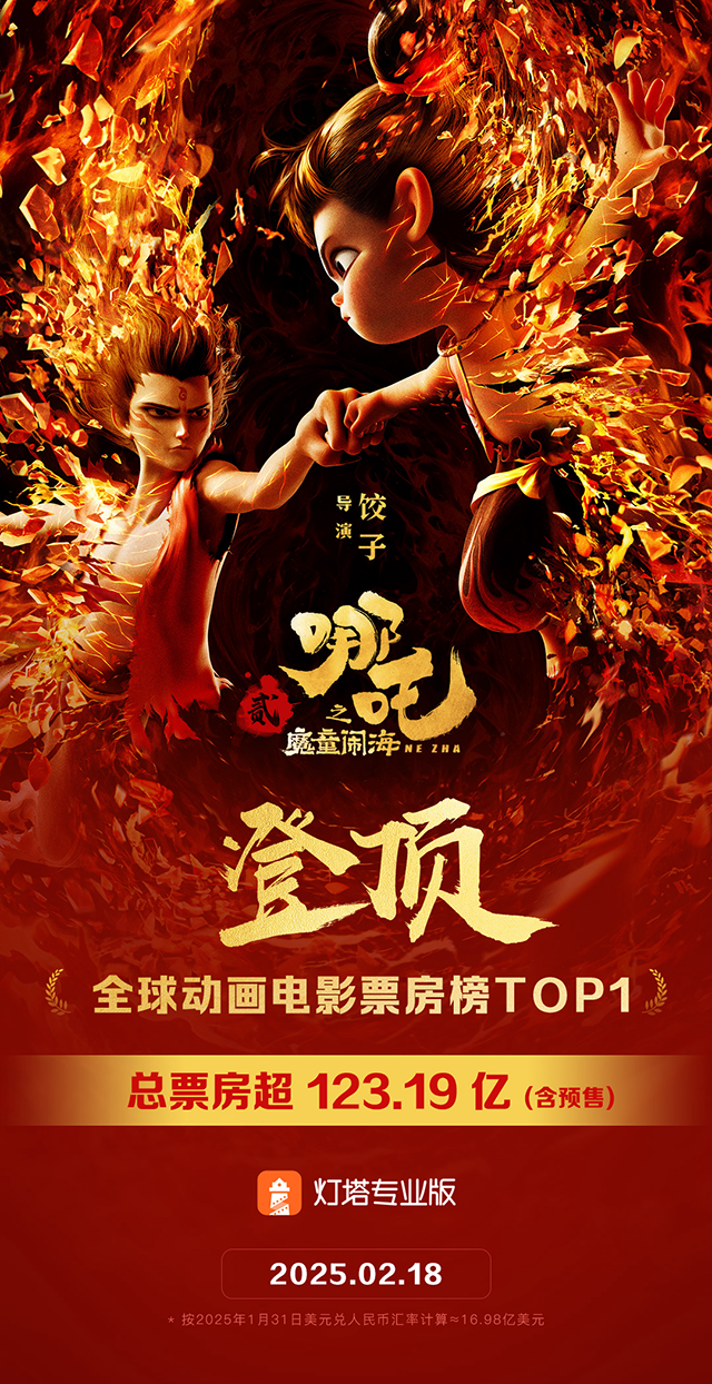 2月18日,據(jù)燈塔專業(yè)版數(shù)據(jù),《哪吒2》登頂全球動(dòng)畫電影票房第一名!