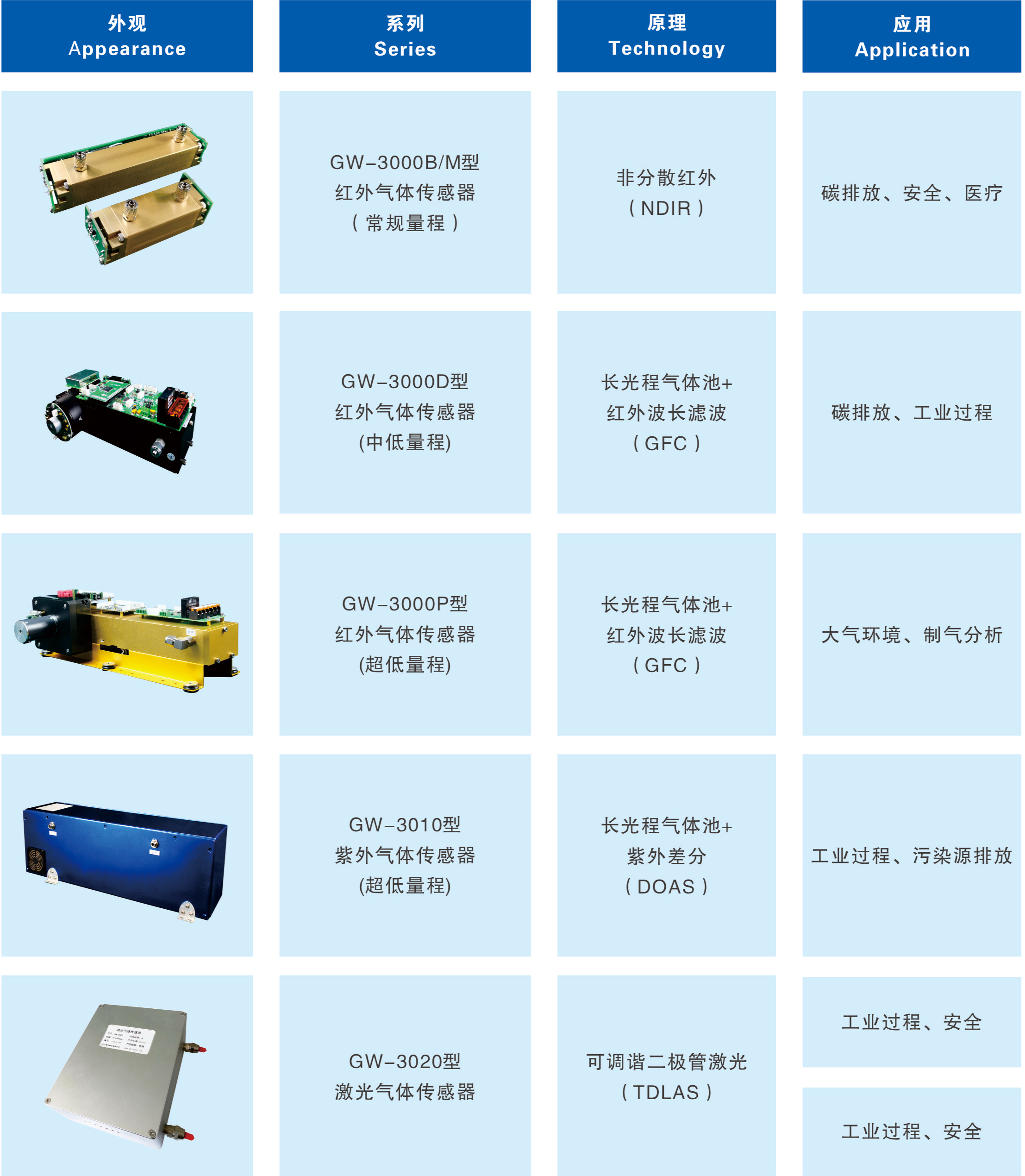 敢為科技擁有非分散紅外氣體檢測技術(shù)、紫外(紅外)差分吸收光譜技術(shù)、紅外氣體相關(guān)濾波檢測技術(shù)等多種光電檢測、光譜分析技術(shù),在這些技術(shù)基礎(chǔ)上我們研制了可用于碳排放檢測、污染源監(jiān)測、工業(yè)過程氣體分析、室內(nèi)空氣質(zhì)量檢測、空分用低濃度檢測等多個應(yīng)用領(lǐng)域的氣體傳感器,可測量CO、CO2、CH4、N2O等多種氣體,型號全、種類多。